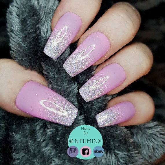 False Nails Pink Holographic Glitter Ombre Full Cover Etsy